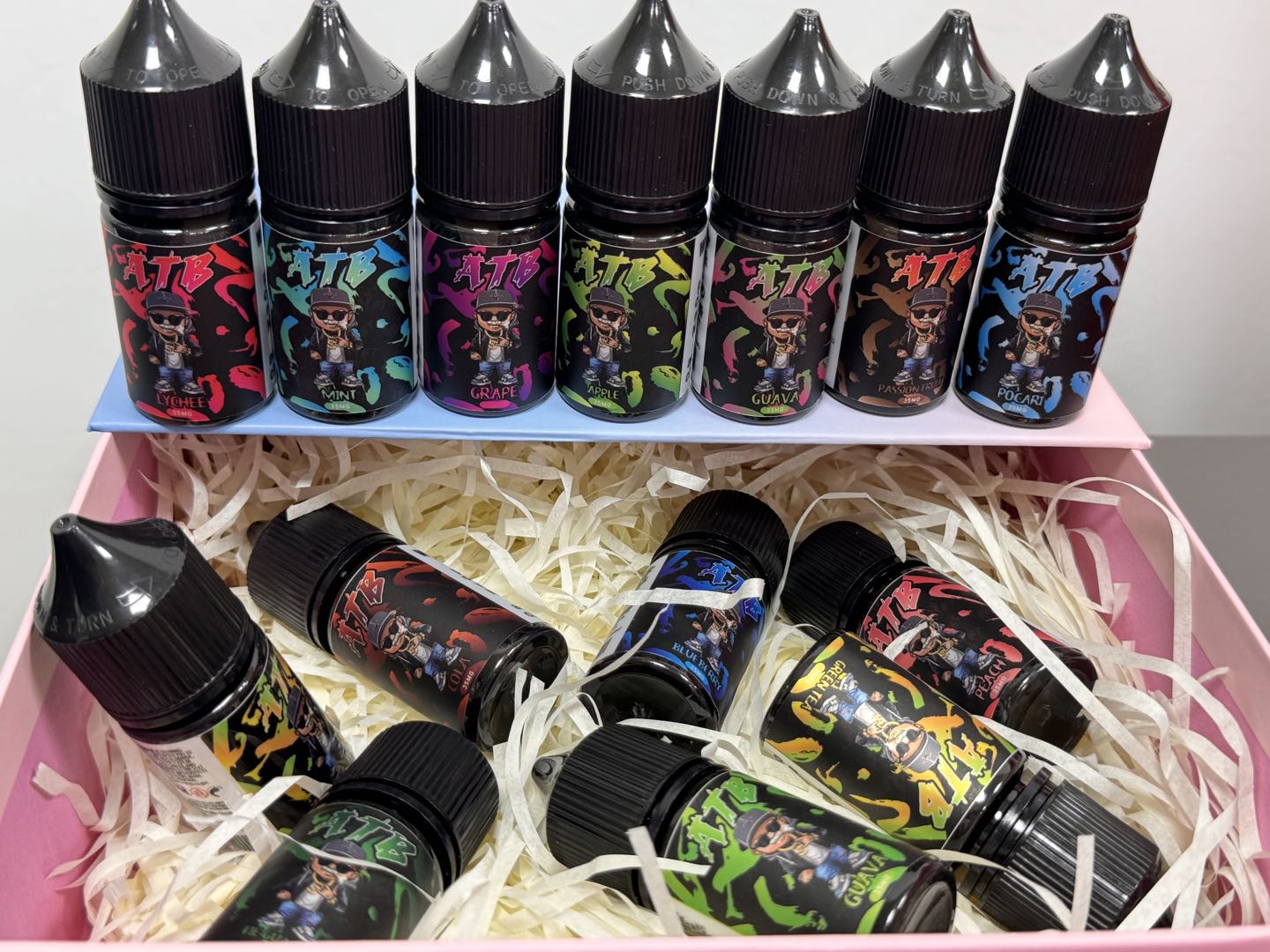 葡萄, 百香果, 多多綠, 荔枝, 芭樂, 薄荷, 可樂, 芒果, 西瓜, 藍莓, 綠茶, 水蜜桃, 鐵觀音, 寶礦力, 蘋果, 古巴煙草, 咖啡, 奇異果, 哈蜜瓜, 檸檬海監